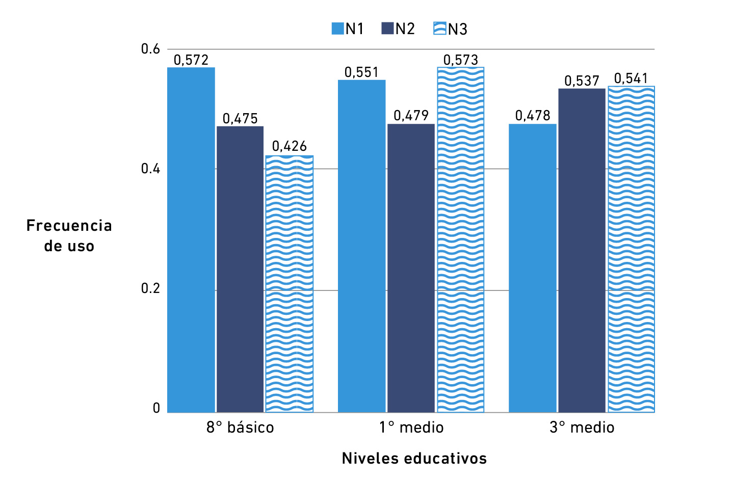 Se observa un incremento en educación media del empleo de sustantivos abstractos (N3), con 1.° medio en la delantera, y un mayor uso de sustantivos concretos (N1) en el nivel de 8.° básico; el que desciende, progresivamente, en el resto de los cursos. No obstante, como señala la prueba estadística, esta diferencia entre niveles no es significativa. Respecto a los sustantivos que registran mayor frecuencia de uso, en la Figura 2 se enseñan los resultados a partir del número de apariciones de la palabra en cada muestra del corpus por nivel escolar: