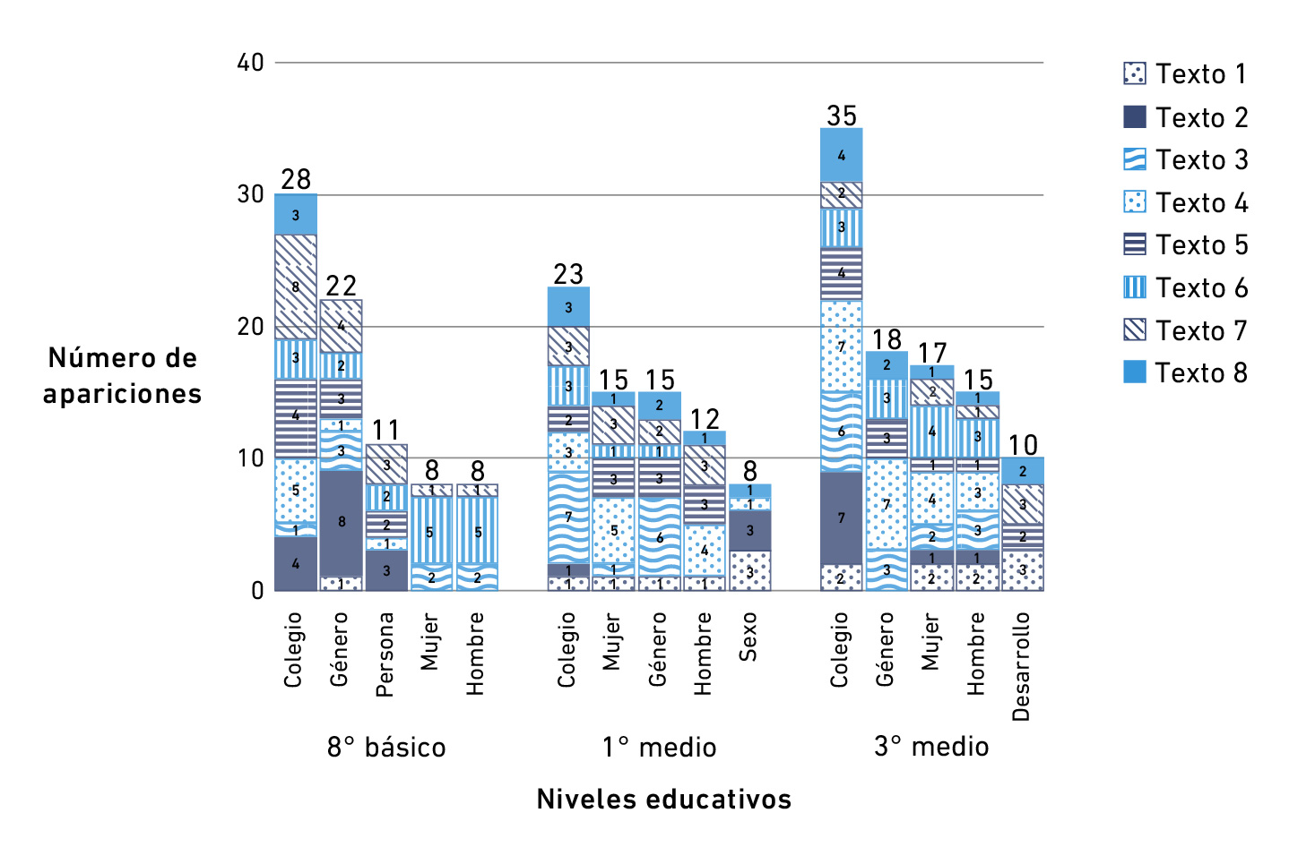Figura 2: Número de apariciones de sustantivos más frecuentes por texto de cada nivel escolar