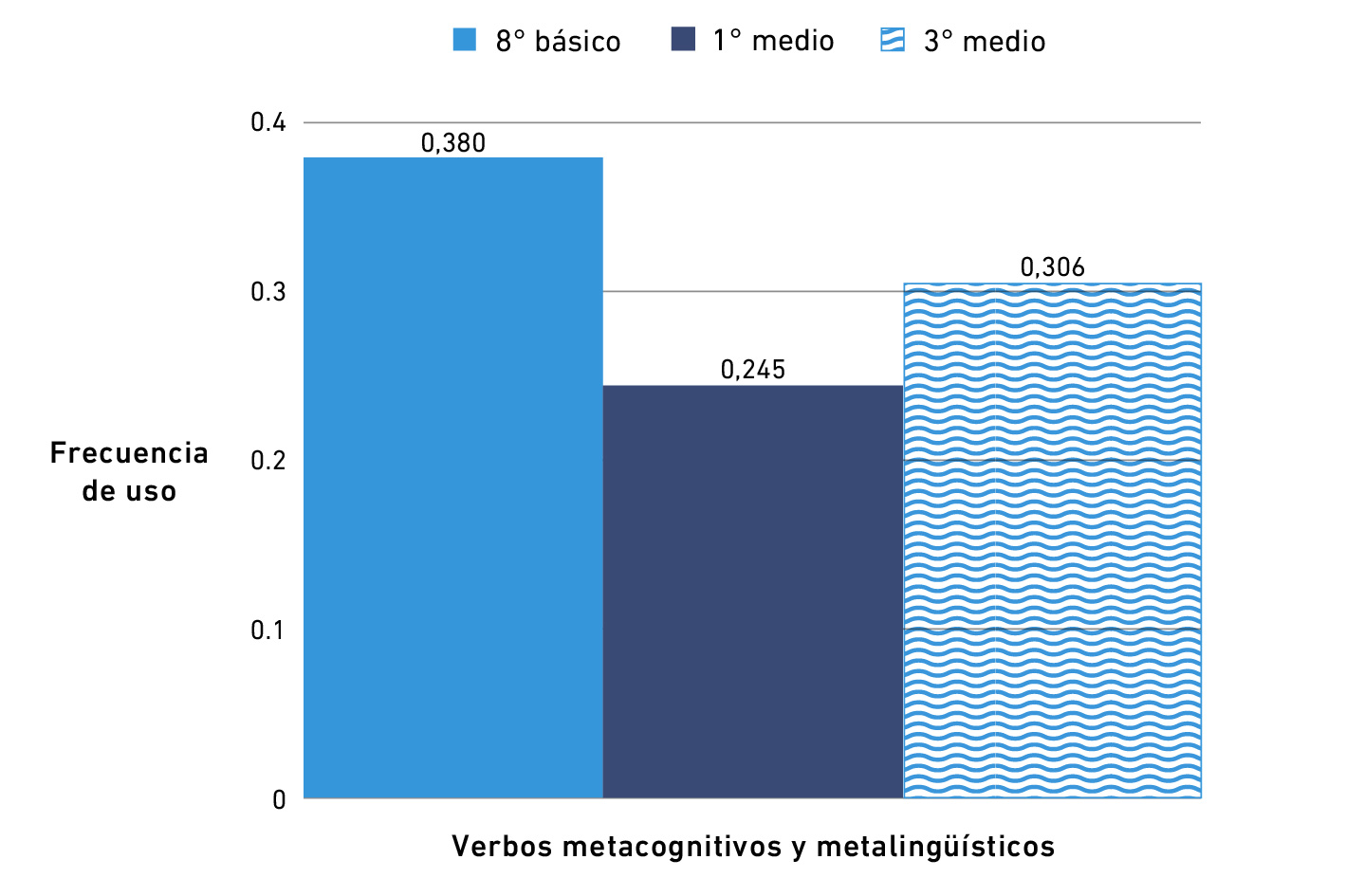 En cuanto al empleo de metaverbos, el resultado de la prueba estadística refleja un factor significativo asociado a la edad/nivel educacional de los participantes. No obstante, contrario a lo esperado, este valor se refiere a mayor frecuencia de uso de metaverbos en el nivel de 8.° básico, el menor de los tres. Por lo tanto, pese a que los estudiantes de cursos superiores emplean una mayor variedad léxica de metaverbos, son los estudiantes más jóvenes quienes utilizan más estos tipos de verbos por cantidad de palabras en sus producciones escritas, como se aprecia en la Figura 3.