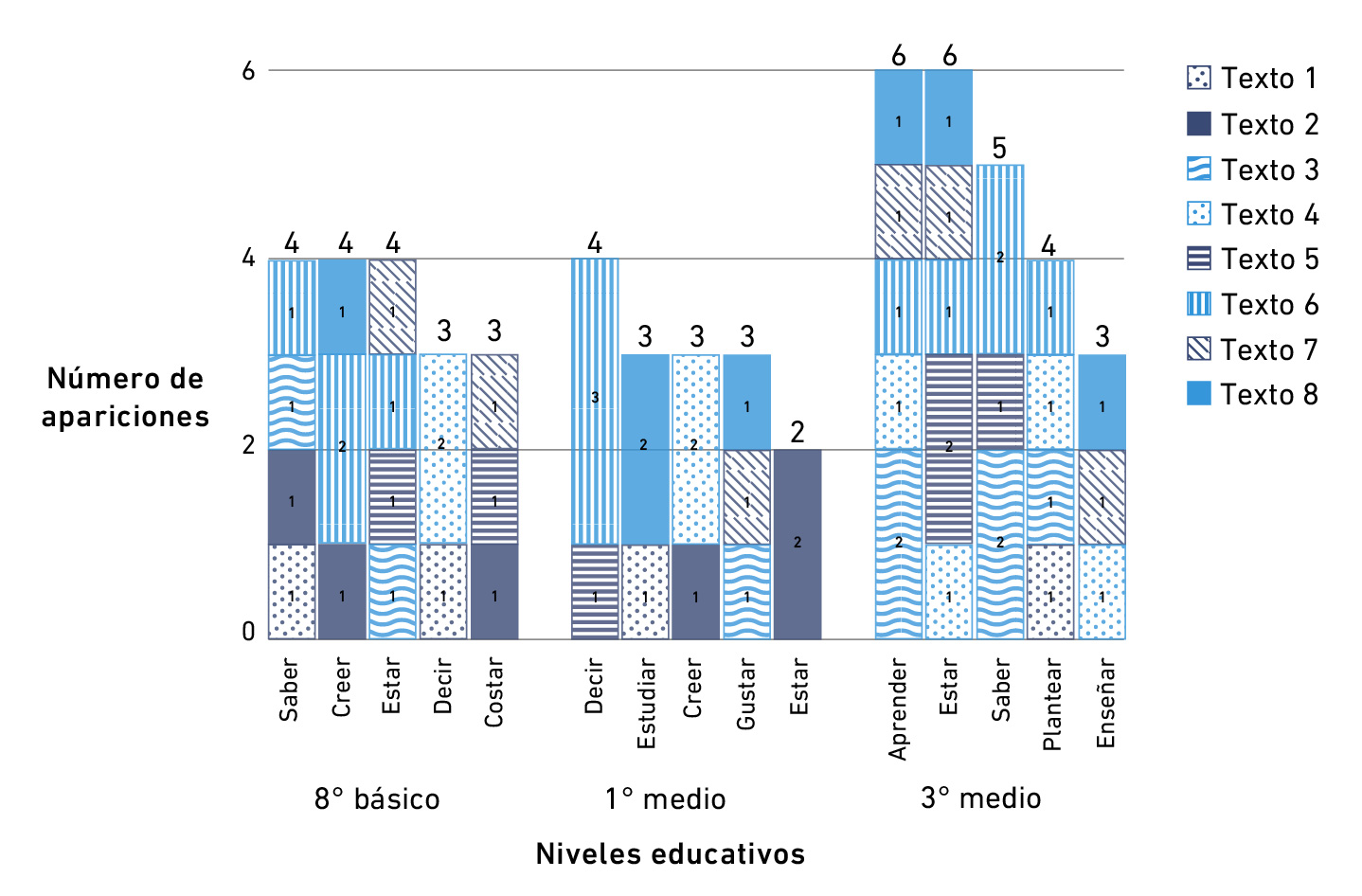 Figura 4: Número de apariciones de metaverbos más frecuentes por texto de cada nivel escolar