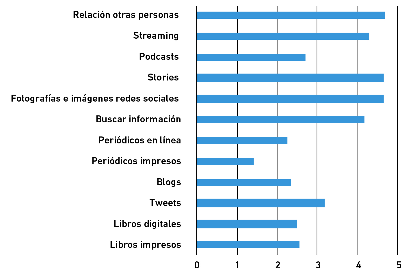La Figura 1 muestra la frecuencia percibida por los estudiantes respecto a sus prácticas lectoras vernáculas. Se reporta una alta realización de las siguientes actividades: relacionarse con otras personas en redes sociales (M = 4.68, DE = 0.60); ver fotografías o imágenes en redes sociales (M = 4.66, DE = 0.67); ver stories (M = 4.65, DE = 0.75); ver contenido en streaming (M = 4.29, DE = 0.88); y buscar información de interés de personal (M = 4.18, DE = 0.85). En contraste, las actividades menos realizadas son leer periódicos impresos (M = 1.41, DE = 0.70) y en línea (M = 2.26, DE = 1.08); leer blogs (M = 2.35, DE = 0.98); y leer libros digitales (M = 2.49, DE = 1.03).