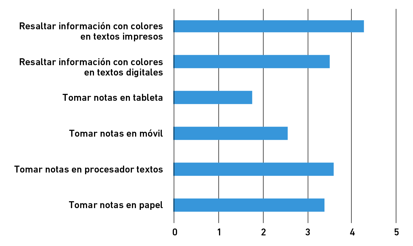 En la Figura 2 se reportan las actividades de estudio vinculadas a la lectura. Las actividades más realizadas son resaltar con colores la información relevante en textos impresos (M = 4.27, DE = 1.09) y textos digitales (M = 3.49, DE = 1.37), seguidas por tomar notas en textos impresos (M = 3.39, DE = 1.14) y digitales (M = 3.60, DE = 1.16). En contraste, las actividades menos realizadas incluyen tomar notas en la tableta (M = 1.77, DE = 1.20) y en el móvil (M = 2.56, DE = 1.17).