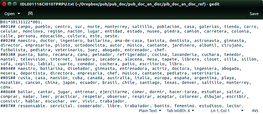 Figura 1.: Organización en hoja de notas de palabras recabadas en encuesta estandarizada para ser procesadas en IDL