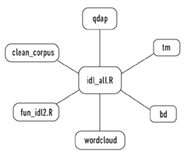 En la Figura 4 se aprecia el diagrama de componentes de R para procesar los datos a partir de las librerías desarrolladas e integradas al programa, utilizadas por el especialista en el área de estadística. Las librerías qdap, tm y wordcloud están disponibles en R, y el resto fueron desarrolladas por el especialista. Mientras IDL calcula exclusivamente el índice de disponibilidad léxica, este programa hará procesos diversos mediante el uso de algoritmos adecuados, de acuerdo con las necesidades del investigador.