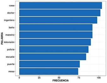 Como muestra de los resultados obtenidos, se construyeron las Tablas 1 y 2, que contienen los vocablos e índice de disponibilidad, respectivamente, con los primeros 10 valores de mayor disponibilidad dados en forma decreciente.