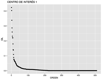 En la sección anterior, básicamente se contabilizaron los vocablos por su frecuencia en todos los centros de interés; sin embargo, cada vocablo tiene relevancia basado en su correspondiente índice de disponibilidad. Mediante el lenguaje R, se desarrolló el código necesario para calcularlo; el tiempo de procesamiento para cada uno de los centros de interés fue de 6.5 segundos aproximadamente. La fórmula utilizada como referencia para el cálculo del IDL es la propuesta por López-Strassburguer (López, 2003):