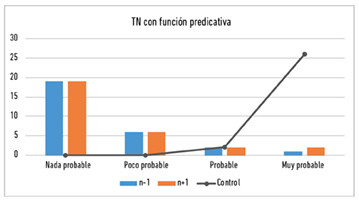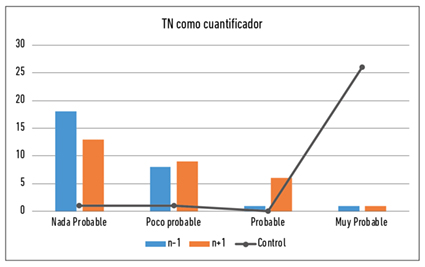 Finalmente, en los dos contextos que teóricamente aceptan solamente las interpretaciones exactas, se encontró que, en ambas variantes n+1 y n-1, las respuestas se concentraron en los dos puntos de rechazo en la escala, tal como era previsto. Esto significa que, efectivamente, no existe aceptación de lecturas intervalares cuando el TN tiene función predicativa, como en el ejemplo 25a, y cuando está antecedido por un determinante definido, como en el ejemplo 25b. Esto concuerda con las afirmaciones teóricas postuladas anteriormente por Geurts (2006) y Curcó (2015), acerca de la función predicativa, así como Curcó (2015) y Villaseñor (2017), sobre los TN con determinante definido.