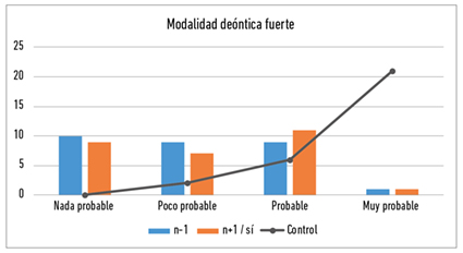 Ahora bien, en el caso de ambas condiciones modales fuertes, las respuestas se distribuyeron de manera prácticamente uniforme tanto en el segundo punto de aceptación como en los puntos de rechazo en la escala (recordando que únicamente en los ítems de control se obtuvo frecuencia significativa de respuestas en el mayor punto de aceptación) y en las dos variantes n+1 y n-1. Esto quiere decir que los datos no mostraron una tendencia ni de rechazo ni de aceptación de las lecturas intervalares.