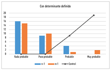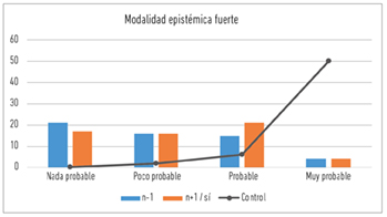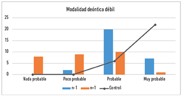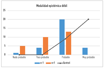 Tanto en la modalidad epistémica débil en el ejemplo 24a como en la deóntica débil en 24b, las respuestas se concentraron en el segundo punto de aceptación (probable) en la variante n-1, de acuerdo con las predicciones formuladas inicialmente. Podemos observar en las gráficas mostradas anteriormente (Figuras 7 y 8) que, mientras en los reactivos de control las respuestas se concentran en el mayor punto de aceptación, en la condición crítica n-1 las respuestas se orientan en el segundo punto, lo que refuerza la idea de que, aun cuando la interpretación intervalar superior es posible, en efecto la lectura preferida es la exacta.