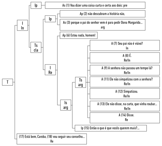 A estratégia adotada por Caroba tem o efeito desejado, já que, na sequência da peça, Dodó, após alguma reticência, reage positivamente: «(17) Está bem, Caroba, (18) vou seguir seu conselho. (19) E se tudo se resolver a contento, (20) eu saberei mostrar minha gratidão.». Nessa reação, ele aceita a razoabilidade do ponto de vista de Caroba e decide seguir sua ordem de não revelar o namoro, ordem que recategoriza como «conselho», e recompensá-la. A reação de Dodó sugere, assim, a revisão/eliminação de sua objeção inicial: «(5) Você está doida, mulher?». A estrutura hierárquico-relacional presente na Figura 2 representa o estudo das relações interativas genéricas do excerto em análise.