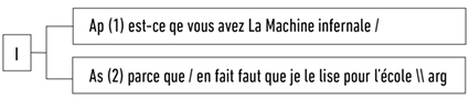 (1) est-ce que vous avez La Machine infernale/(2) parce que/en fait faut que je le lise pour l’école \\