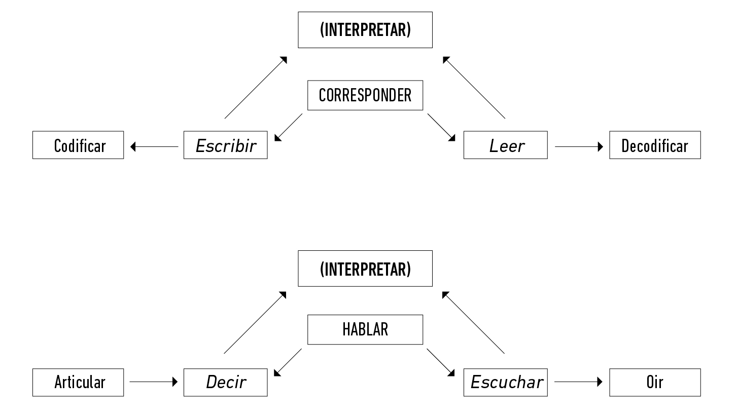 Aunque el lenguaje escrito es tomado como ejemplo en ambos modelos, para Widdowson (1978) es claro que la interpretación subyace a todos los usos de la lengua. Así, ya no podemos hablar únicamente de las cuatro habilidades tradicionales. El autor aclara que la distinción entre hablar, escuchar, leer y escribir se refiere únicamente a la manifestación física del lenguaje, es decir, al medio a través el cual se transmite un mensaje: aural para la oralidad y visual para el lenguaje escrito. Asimismo, alude a los papeles activo y pasivo que el modelo de comunicación clásico les concede a los participantes. Pero no fue Widdowson ni el primero ni el último en tildar de simplista esta perspectiva (e. g.Moreno [2014]). Para él, esta solo daría cuenta de la lengua como sistema formal, a la habilidad de producir oraciones gramaticalmente correctas (use). Pero, para comunicar, falta además reconocer el valor de un enunciado dentro del discurso como acabamos de revisar (usage). Widdowson (1978) postula entonces el modelo mostrado en la Figura 1.