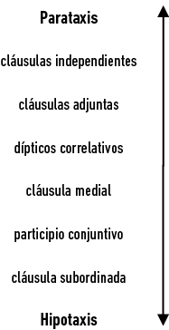 Lehmann (1988) plantea una escala entre dos polos de máxima y mínima elaboración de la información léxica y gramatical codificada en una cláusula. Esta escala se define por una serie continua de paralelos que refieren distintos parámetros como la jerarquía descendente (hierarchical downgrading), el nivel sintáctico de inclusión, la desentencialización (desentencialization), el grado de gramaticalización del predicado principal, las relaciones entre las cláusulas y la explicitud del enlace.