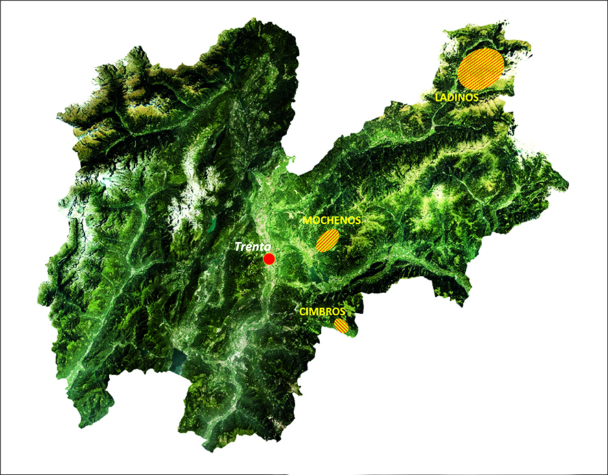 En este artículo, me centraré en el caso de los ladinos, móchenos2 y cimbros, las tres minorías oficialmente reconocidas en la provincia de Trento, región de Trentino-Alto Adigio/Tirol del sur (nordeste de Italia). Estas representan tres ejemplos de la variedad cultural de la península italiana y de los problemas de protección y de valorización de estos patrimonios culturales. El ladino, el mócheno y el cimbro son tres lenguas diferentes habladas en tres partes diferentes de la provincia de Trento, pero que tienen muchos aspectos comunes, principalmente un futuro bastante incierto.