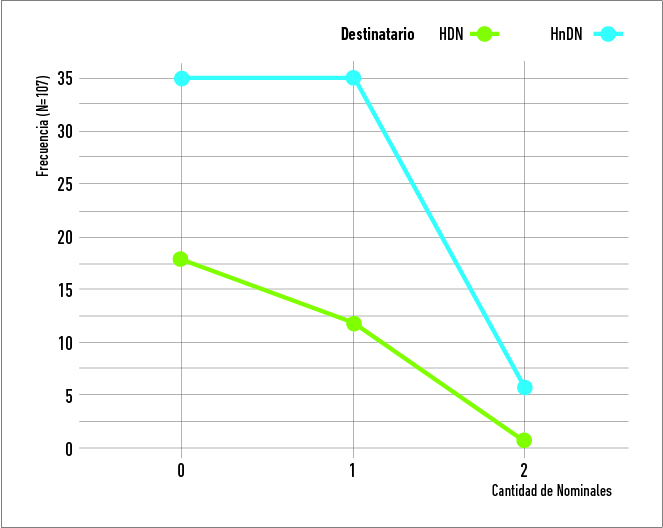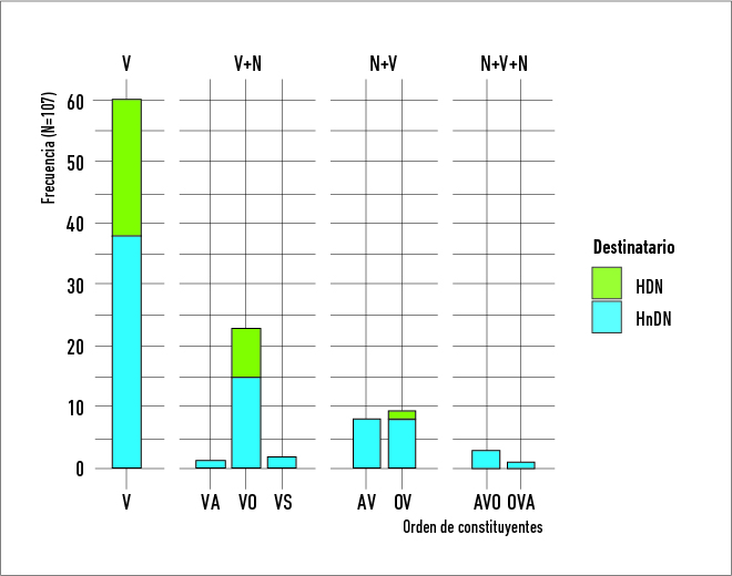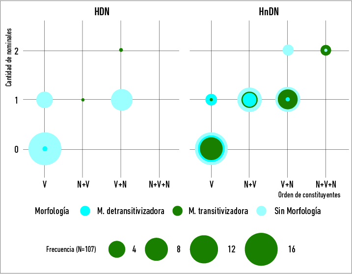 Las cláusulas de la muestra fueron codificadas manualmente especificando el valor de los siguientes indicadores de transitividad sintácticos y morfológicos: (1) la cantidad de elementos nominales independientes (N), entre argumentos y adjuntos: «0N», «1N», «2N»; (2) el orden de constituyentes o argumentos nucleares: «V», «N+V», «V+N», «N+V+N», y (3) la presencia de morfología indicadora de la transitividad: «ausencia», «morfología transitivizadora» (de aumento de valencia verbal), «morfología detransitivizadora» (de disminución de valencia verbal). En el cálculo de N, se consideraron los pronombres (personales, demostrativos, interrogativos, etc.) y las frases nominales léxicas, pero se excluyeron los vocativos. A su vez, dado que el orden de constituyentes en toba/qom se rige por una jerarquía de persona, se identificó cada N como (1) pronombre personal de 1.ª o 2.ª persona, (2) pronombre personal de 3.ª persona, demostrativo o interrogativo y (3) frase nominal léxica. Para la codificación de la cantidad de N, el orden de constituyentes y los patrones de coocurrencia, se excluyeron las cláusulas incompletas, determinando un total analizado de 107 cláusulas. Respecto de la morfología, se distinguió si era prefijada o sufijada al verbo y si indicaba que la cláusula era transitiva o intransitiva16.