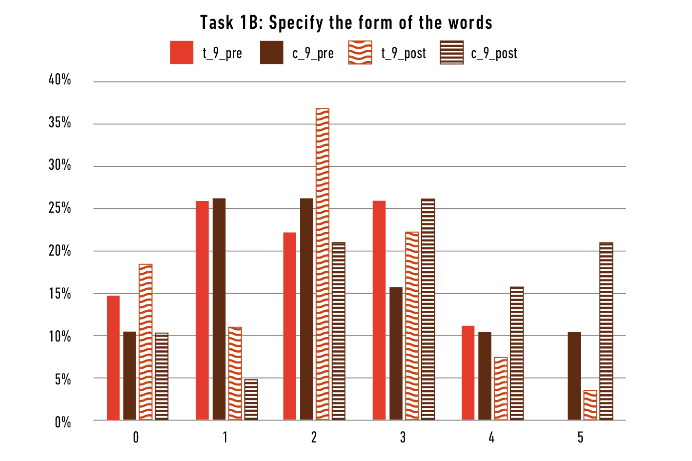 In general, the study can just vaguely point the way ahead for vocabulary work and learning in Latin classes. Because of the unmanageable confounding factors in an authentic educational context and the long period it took to complete, the correlation of test results and intervention is at most a weak one15. The reading comprehension test mainly refers to an ability that is in great demand and intensely promoted during the first year at high school, since learning is increasingly carried out via texts. Thus, it is not entirely surprising that the overall performance of the studied groups reached a higher level in the post-test -with one exception (Figure 9). The results of the second control group (c2) cannot be included in the evaluation since the group obviously did not cooperate in the post-test16.