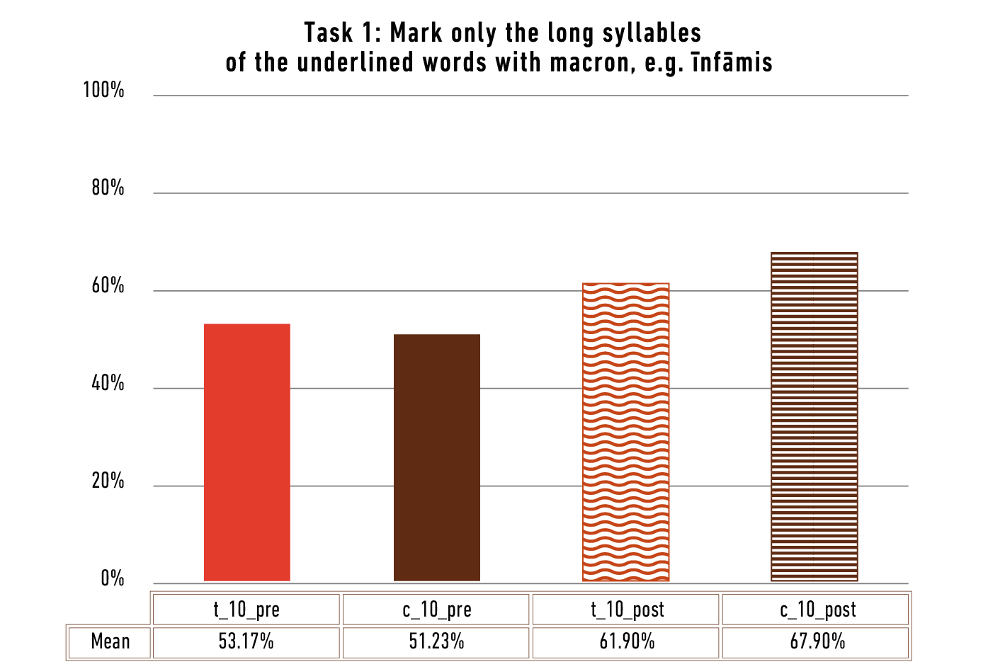 After practising metre (i.e., indicating syllable lengths in a hexameter) in the regular Latin class before this study started, both tasks should have been an easy introduction to the tests. Astonishingly, the results contradicted this assumption. Although the students rated the difficulty of both tasks as rather easy, they failed to achieve a high score on average. Despite the visible improvement between pre-test and post-test in task 1 (Median: 50.00%; 50.00%; 66.67%; 83.33%. Especially the development of the median indicates that the majority of all students achieve higher scores in the post-test than in the pre-test.