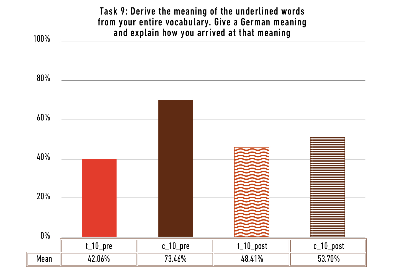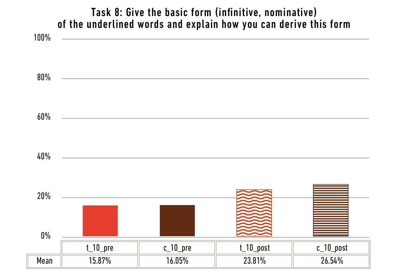 To solve this task students have to rely on (metacognitive) strategies when retrieving lexical information from their mental lexicon. The underlined words (pre-test: mixta, iunguntur, facies; post-test: admovet, flectitur, facies) are neither part of the abovementioned 165 lemmata of the learning vocabulary nor totally unknown. Although the students declare this task rather difficult, even the usually low-performing test group achieves 42% in the pre-test (c = 73%) and improves its results in the post-test a little (48%, growth rate: 15%; Figure 8). This might indicate that the intervention helped the test group to perform better. However, what happened to the control group? The average score drops by almost 20% and is now only 54%. There might have been some confounding factors like a lack of working time (task 10 shows a similar decline). Nevertheless, another explanation is also possible, if one evaluates the answers given for the Latin word facies that is asked for in both tests. In the pre-test, 24 students of the control group know the word meaning and derivation, with very few erroneous associations. However, in the post-test only 10 students of this group are able to recall the meaning and the derivation. This might indicate that the word facies was «known» by chance in the pre-test, because it had been used previously. Therefore, almost all students knew it (24 out of 27). By contrast, in the post-test only those students could answer correctly who really had learned the word and could recall it from the mental lexicon.