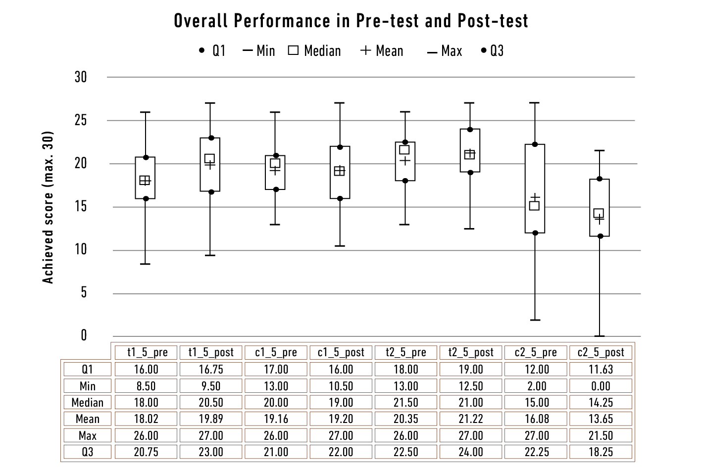 However, as seen in Every group achieves a lower score on average, as the growth rates show: Mean growth rate: t1 = -3.93%; c1 = -7.37%; t2 = -4.26%; c2 = -34.08%. Median growth rate: t1 = -11.11%; c1 = -7.14%; t2 = -13.33%; c2 = -27.27%. Both the overall performance and the interquartile range increase considerably for t1, c1, and t2.