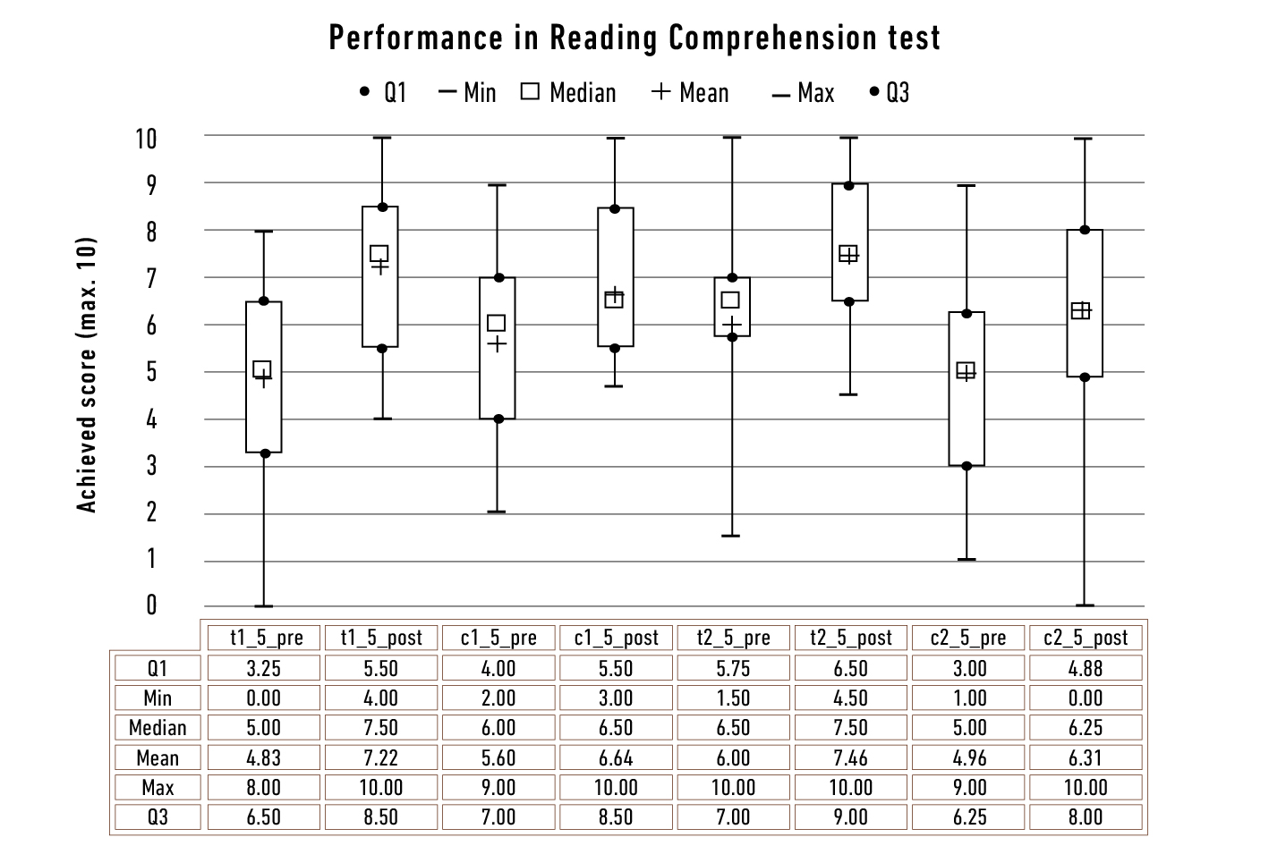 Figure 10, the general improvement is not due to the knowledge about vocabulary, but to the increased scores in the reading comprehension test (Figure 11). In a way, the higher scores of the reading comprehension were anticipated due to the increased practice of reading, but there is one striking feature: On average, both test groups achieved a higher score with a median of 75% (c1 = 65%, c2 = 63%). Furthermore, there are no extreme outliers anymore in both test groups. Considering the explicit training on context awareness the groups received in the intervention, this might suggest that more students in these groups were able to decode information by noticing the context.