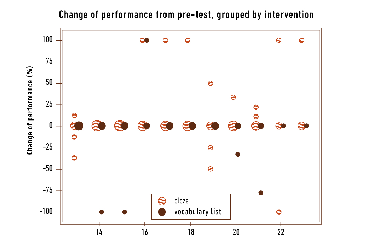 Figure 18 indicates that most participants of the intervention show no signs of improvement at all, suggesting that they either (1) already achieved the highest score or (2) failed completely in both the pre-test and the post-test. Typically, the former is the case, especially in a highly advanced learner group as the study group. While this case may be of little interest since there is hardly any opportunity for improvement except for presenting harder exercises, the cases that deviated in the post-test are much more remarkable: If there was a deviation, participants who learned with a vocabulary list generally changed for the worse, while those with a cloze usually improved their score. Even though it cannot be disputed that there are a few exceptions where cloze learners’ performance slightly decreased, there is on the other hand only one example of a student learning with a vocabulary list who obtained a better result for a specific exercise in the post-test. Thus, in general, learning vocabulary in context seems to be correlated with better performance on the given vocabulary test.