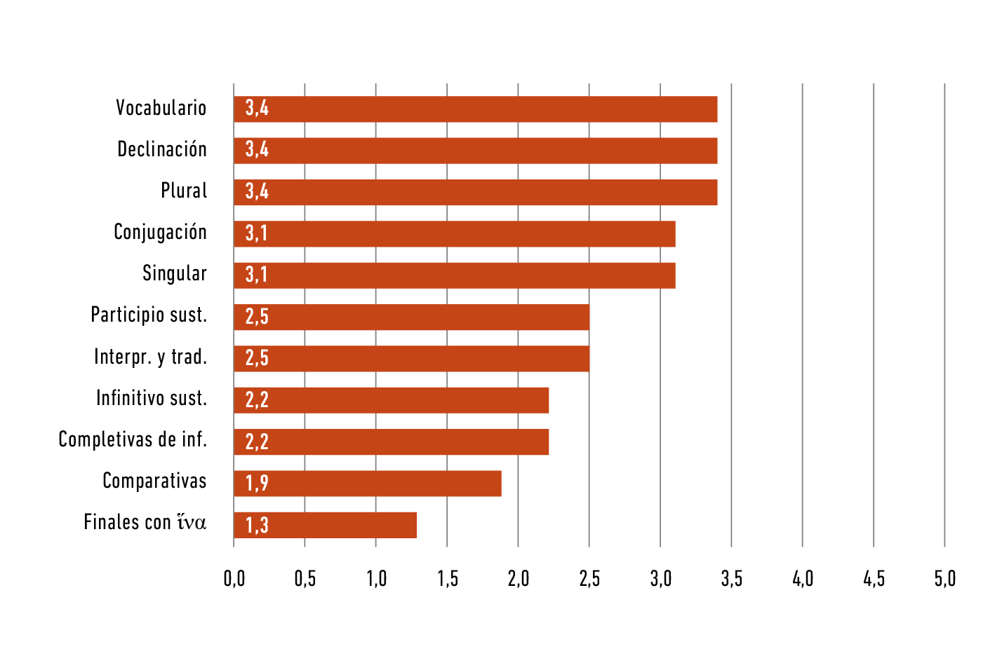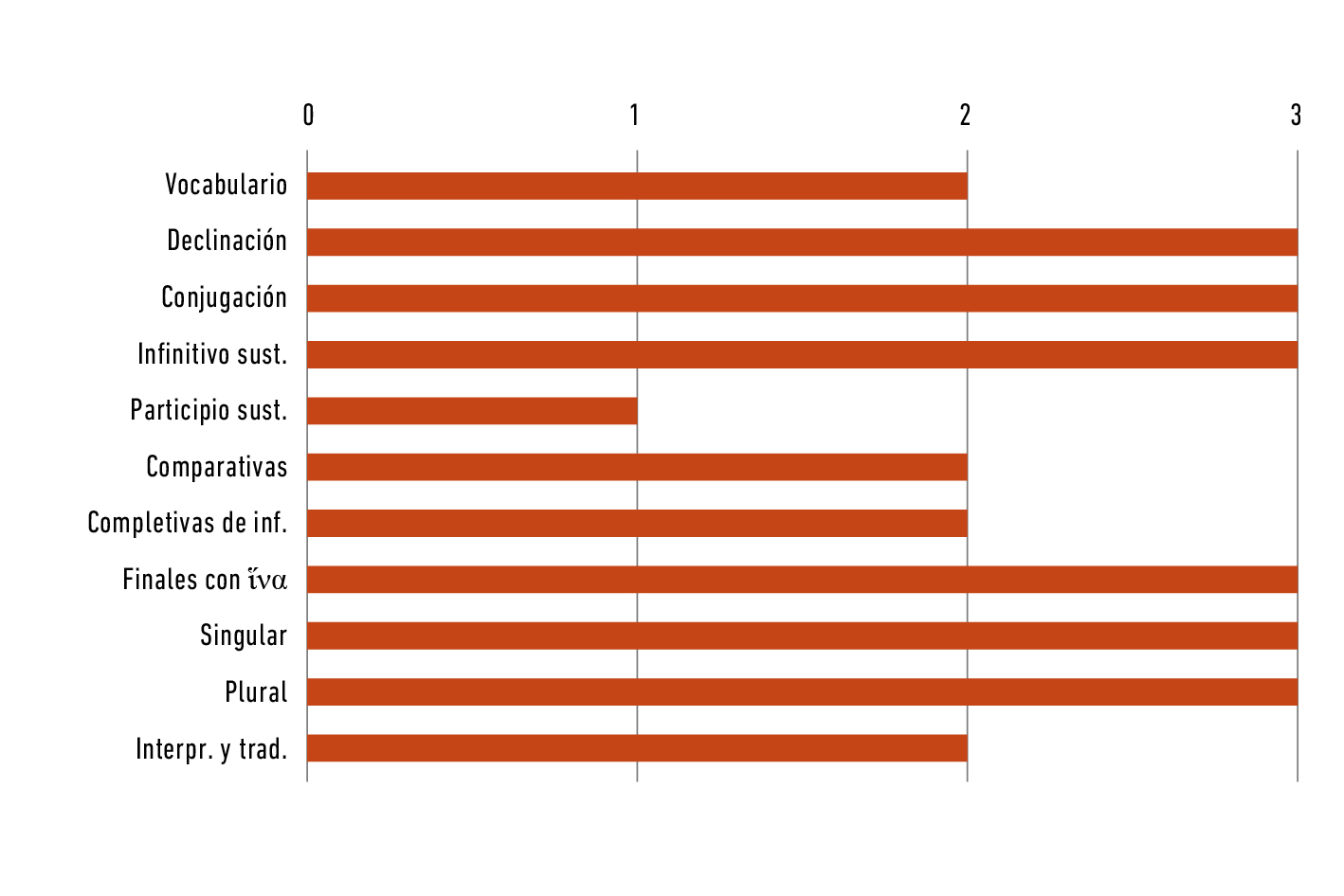 Finalmente, los resultados de la evaluación escrita del último corte del primer semestre de 2018 fueron altos (Figura 7), en comparación con los del semestre anterior (Figura 8). La comprensión de temas gramaticales mejoró notablemente. Se evidencia un aumento importante en el promedio general del parcial final, pues en el segundo semestre de 2017 fue de 2.3 y en el primer semestre de 2018 subió a 3.7. Las mayores dificultades que presentaban los estudiantes fueron parcialmente superadas, pues las oraciones completivas de infinitivo con acusativo y el infinitivo sustantivado fueron identificadas con más facilidad. Con respecto a las oraciones comparativas, aunque aumentaron aproximadamente el doble en su nota, aún se encuentran entre los temas de difícil asimilación. Por otro lado, se determinaron otras dificultades como la interpretación y traducción del texto aristotélico18 y los participios sustantivados. Adicionalmente, es evidente que los estudiantes identificaron con mayor facilidad el número y el caso de sustantivos, adjetivos y pronombres. En cuanto a la conjugación, fue el tema con mejores resultados.