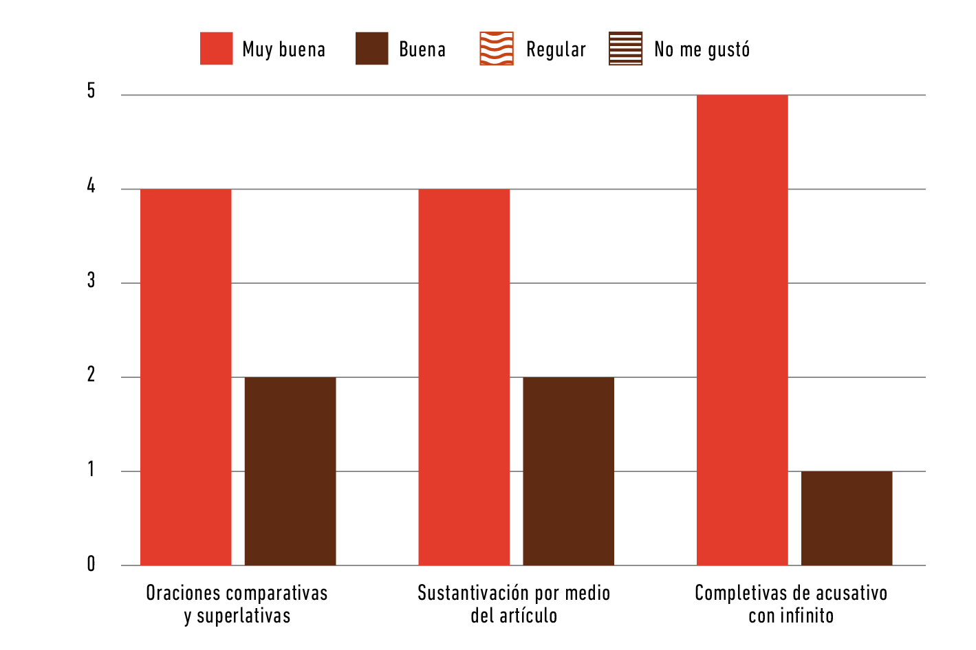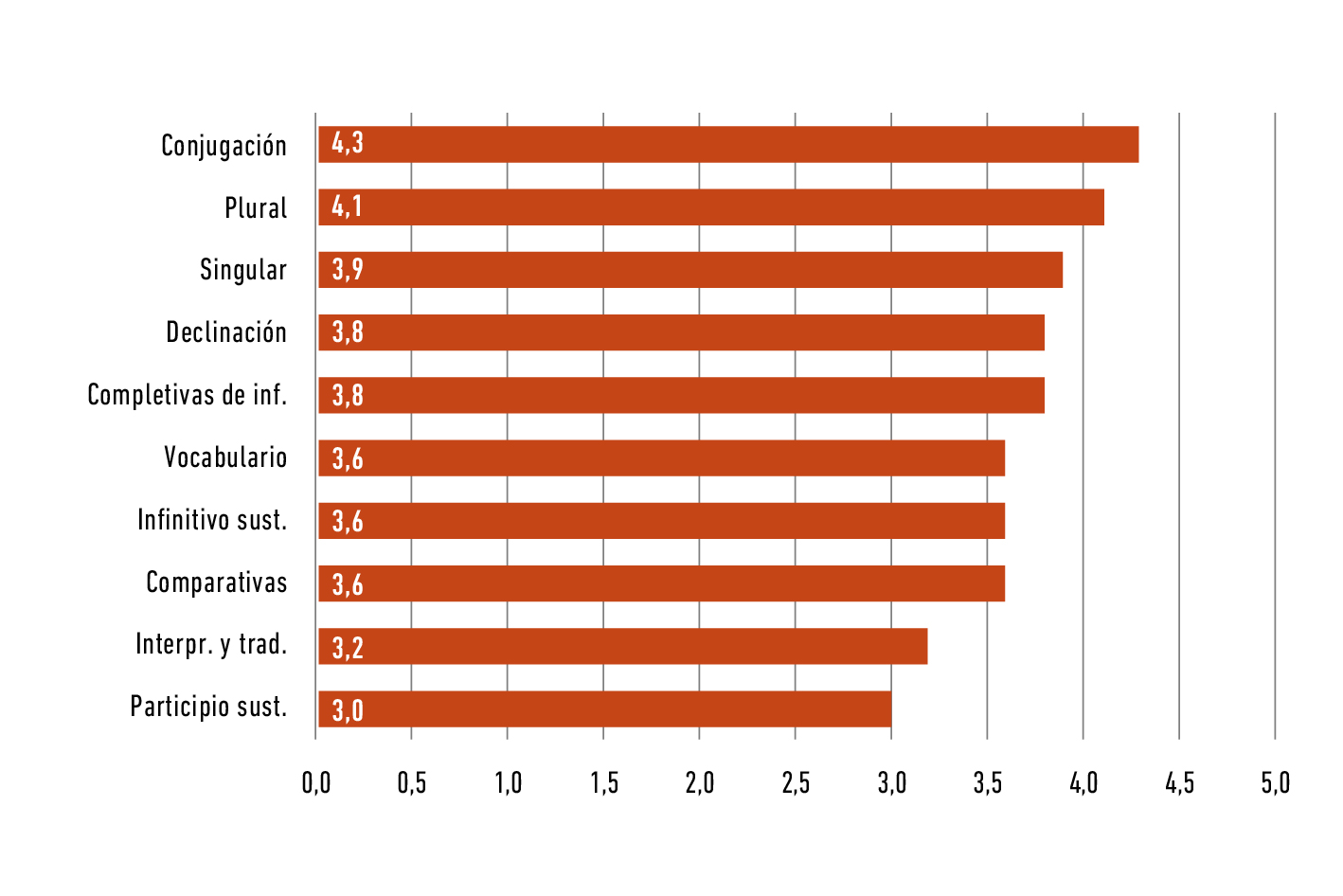 Debido a que la pregunta 13 de la autoevaluación es abierta y la hoja de cálculo también, lo cual permite generar gráficos generales del curso, el sistema de evaluación en sí mismo se convirtió en un instrumento valioso para la recolección de datos, puesto que posibilita conocer la opinión de los estudiantes del curso y comprender las dificultades que presentan, lo que contribuye a mejorar las clases y sus actividades. Ejemplo de ello es el resultado general del curso que se ha puesto como ejemplo, cuyo gráfico muestra que el participio sustantivado es el tema gramatical que más les costó comprender, por lo que en los cursos siguientes se procuró ofrecer mejores explicaciones sobre el asunto (Figura 2):
