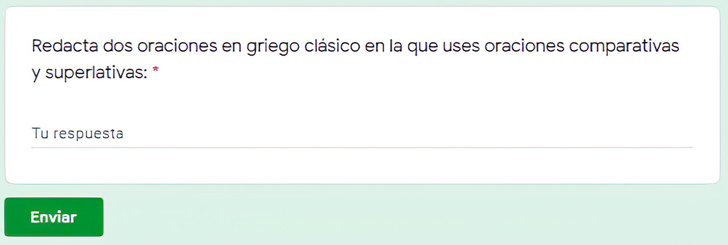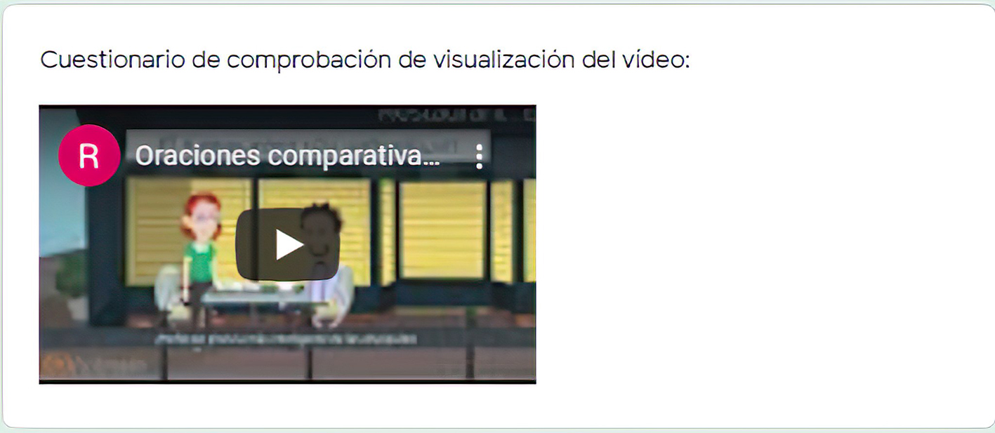 Cada video debe contar con un cuestionario como comprobación de su visualización y del estudio previo del tema por parte del estudiante (Triana, 2018), de manera que deben contar al menos con un ejercicio de redacción o de puesta en práctica de los temas examinados. Los cuestionarios no solo dejan evidencia de que el alumno realizó la tarea, sino que permite evaluar qué tan efectiva es la explicación del video, ya que el docente obtiene información para realizar la retroalimentación correspondiente. Se presenta a continuación el cuestionario diseñado en Google Forms para las oraciones comparativas y superlativas: