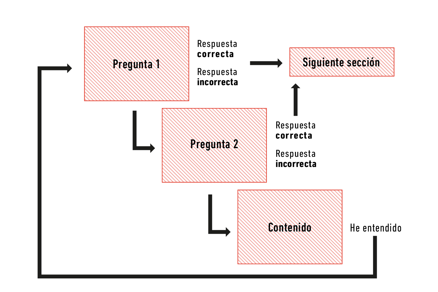 No es necesario contestar todas las preguntas de manera correcta para pasar a la siguiente sección, basta con responder una pregunta con la respuesta apropiada y el estudiante será dirigido a la sección que sigue. Si se equivoca en la primera, Virtual Sabana lo direcciona a la siguiente pregunta de la misma sección; y si esta vez selecciona la respuesta correcta, pasa a la sección que sigue. No obstante, si en esta nuevamente se equivoca, pasará a una página de contenido con la explicación teórica de la sección y tendrá la oportunidad de volver a responder las preguntas (Figura 11).