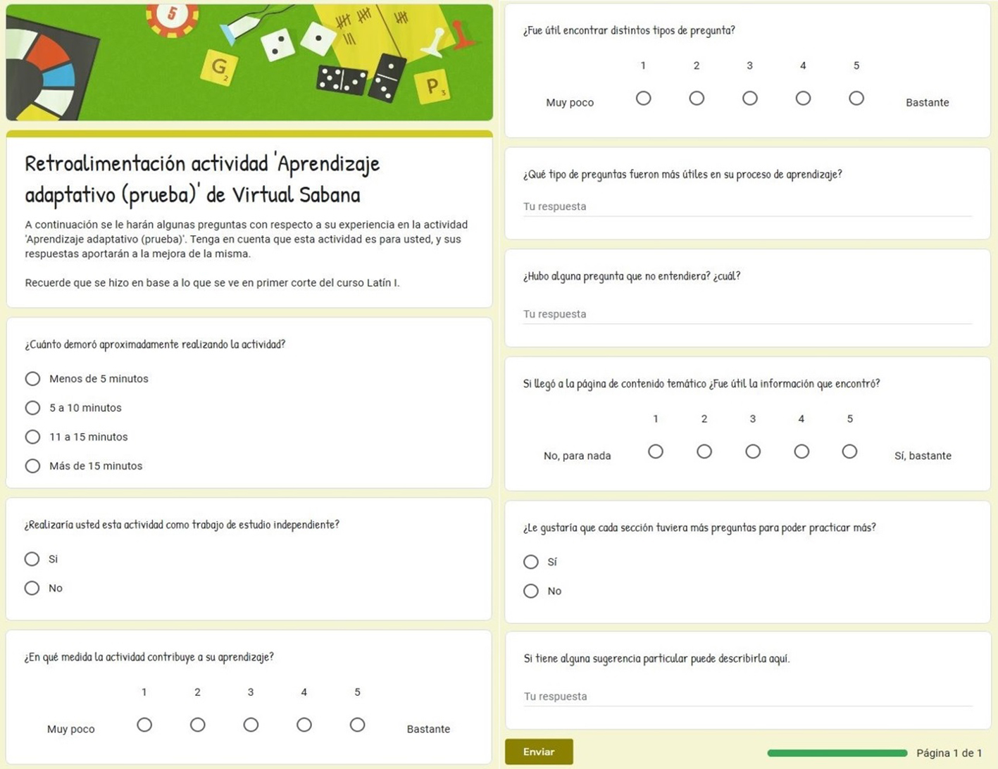 Una vez creada la actividad con ayuda del experto y del docente a cargo del curso, se solicitó a los estudiantes del curso Latín I del semestre 2019-II que la realizaran y, al finalizar, respondieran algunas preguntas para retroalimentar el diseño de la actividad. En la Figura 12, se presenta la encuesta hecha en Google Forms y las conclusiones más relevantes a partir de los resultados de ella: