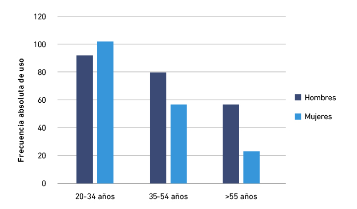 En primer lugar, observamos en la Figura 2 la relación entre la edad y el sexo y la frecuencia de empleo de la locución objeto de nuestro estudio. Vemos que, en general, tanto en hombres como en mujeres el empleo de «un poco» pragmático disminuye mientras los informantes van avanzando en edad. Solo en la primera generación, las mujeres superan a los hombres, si bien es cierto que la diferencia entre ambos sexos no es muy acusada, a diferencia de lo que podemos observar en los dos siguientes sociolectos.
