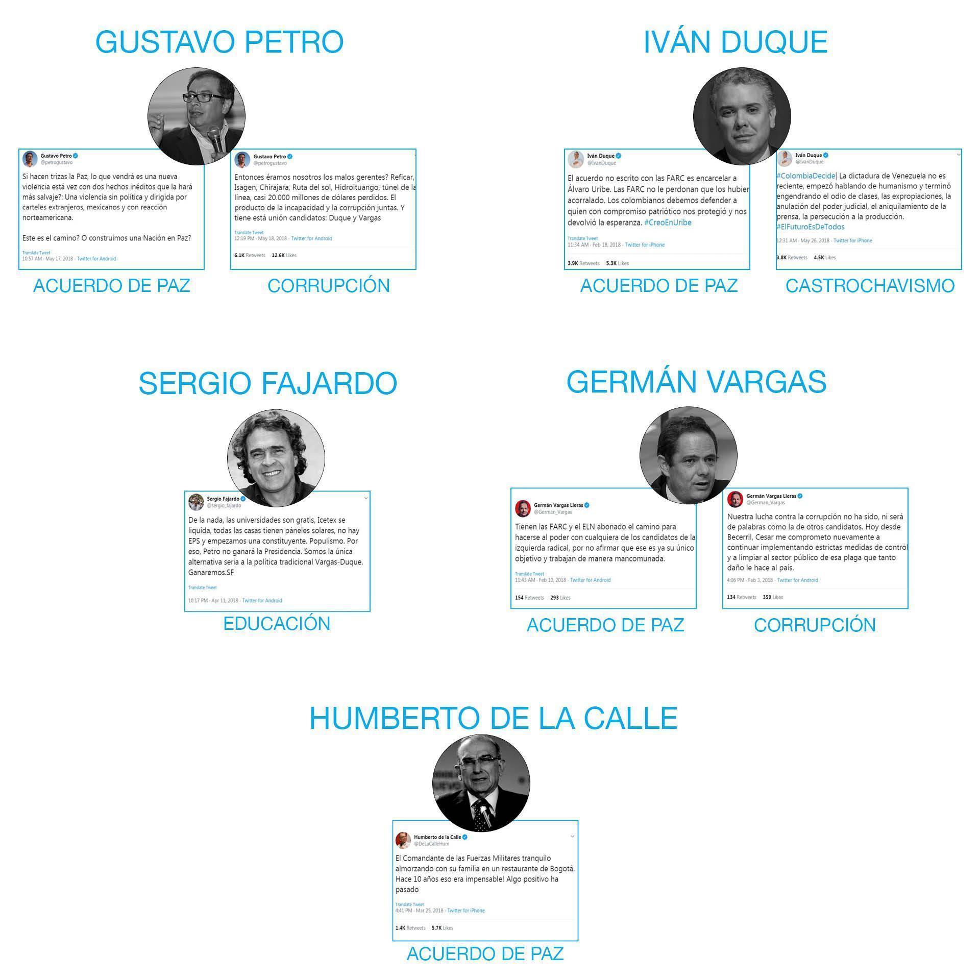 A partir de los datos encontrados se realizó un proceso de etnografía virtual (Marwick, 2014) que permitió identificar las categorías de enunciación más prominentes —proceso de paz, corrupción, castrochavismo 2 , educación—. Resaltamos que la última categoría surgió debido a que el candidato Sergio Fajardo no presentó datos significativos sobre las tres primeras categorías, por lo cual se realizó un segundo proceso de medición de sus tuits, dando por resultado la categoría de educación. El candidato con mayor número de tuits del proceso de paz, castrochavismo y educación, fue Humberto de la Calle, ex negociador del gobierno en los acuerdos de paz con la ex-guerrilla FARC-EP. La tabla 1 presenta los candidatos en el orden de votaciones obtenidas, siendo Iván Duque el ganador de la campaña en 2018.