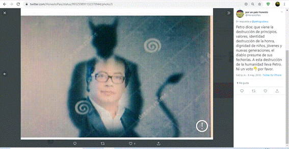 Para el caso del segundo tuit, relacionado con la categoría “castrochavismo”, se efectuaron 4.530 me gusta, 3.853 retuits y aproximadamente 3.550 comentarios. Al igual que con los candidatos anteriores, la imagen fue un elemento fundamental para influenciar o incidir en la dinámica de las interacciones. Aquí se presentó un marcado uso de fotomontajes, con la intención de ridiculizar al candidato o de manifestar inconformidad u oposición con su discurso. Asimismo, los fotomontajes implementados sirvieron para burlarse de los contradictores de Iván Duque.