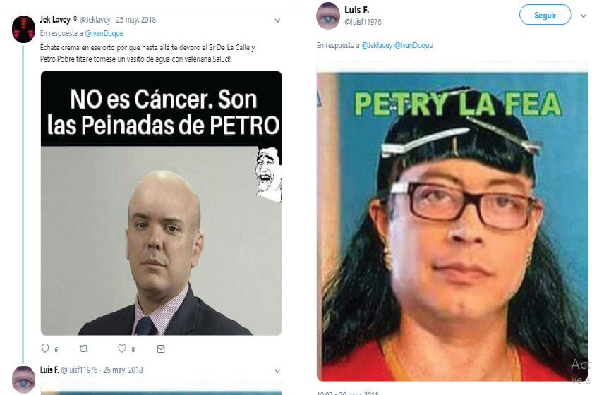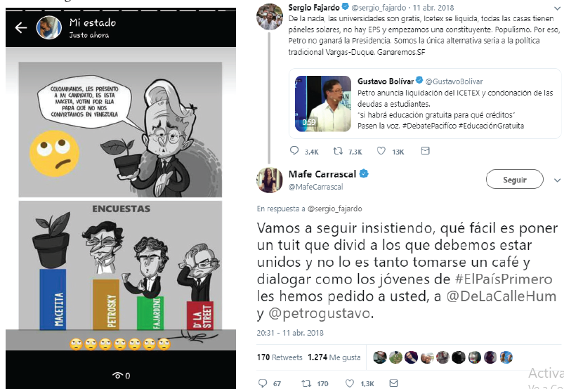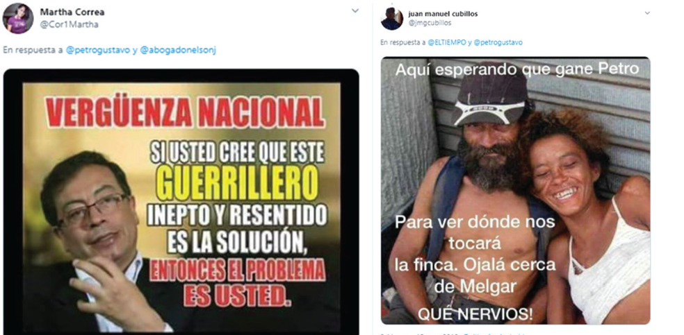 En el caso de las campañas presidenciales, esta situación estuvo desvinculada de los hechos o del conocimiento sobre los programas políticos propuestos por los candidatos, es más, muchas de las imágenes y los videos editados poco o nada tenían que ver con dichas propuestas. Más aún, estos recursos fueron logrados gracias a la apropiación y al conocimiento de la herramienta tecnológica, e implementados para aludir a la emocionalidad como estrategia de tergiversación de la información. Lo anterior se evidenció en confrontaciones en las que se opacaba al interlocutor con un meme impactante, que servía para que los demás participantes se concentrarán en la imagen, mientras se invisibilizaba al emisor inicial, aunque su discurso tuviera más conocimiento o coherencia con relación a los proyectos políticos de los candidatos.