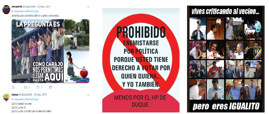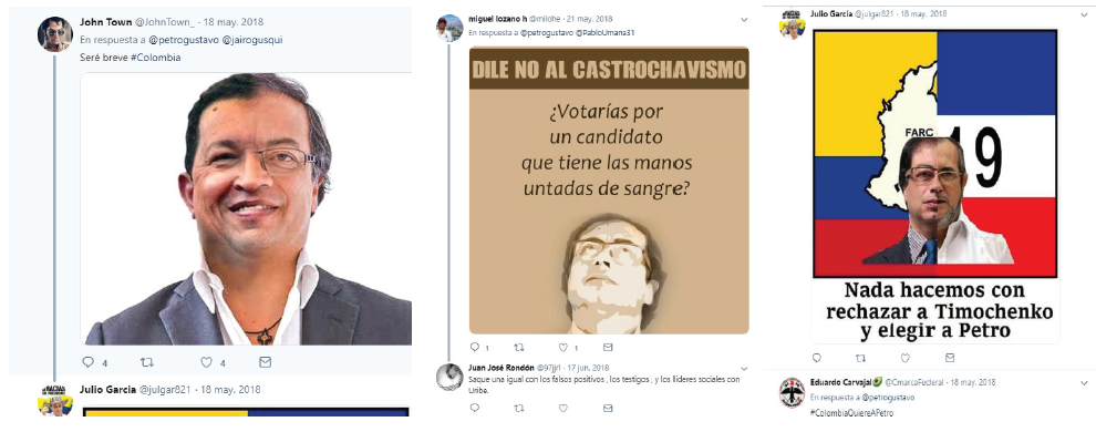 No se observa el uso de fotomontajes ni de imágenes explícitas atacando al candidato. De igual manera, hubo un bajo número de interacciones de perfiles trolls o falsos, los cuales fueron, en algunos casos, los productores de enunciados gráficos violentos. Tampoco fue muy recurrente la incrustación de videos. En su lugar, predominó la argumentación por texto, acudiendo a los hashtags, a las menciones directas (@) y a algunos datos de noticias expuestos a través de capturas de pantalla.