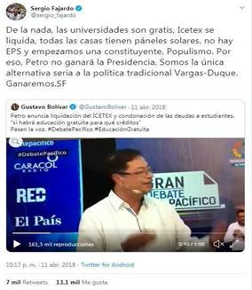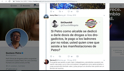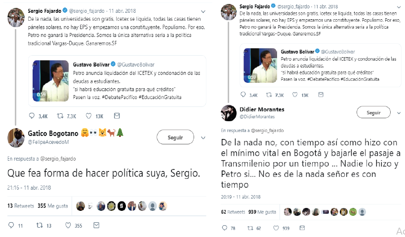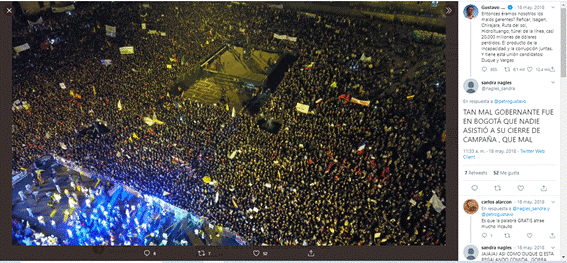 Sin embargo, es evidente que las interacciones con esta cuenta, y con este tuit en particular son considerablemente menores en comparación con la participación de otros usuarios en las cuentas de los anteriores candidatos. Quienes apoyaban la campaña de Germán Vargas no se apropiaron significativamente de Twitter y no lograron generar grandes tendencias en las redes sociales.