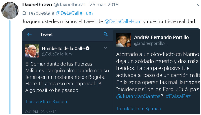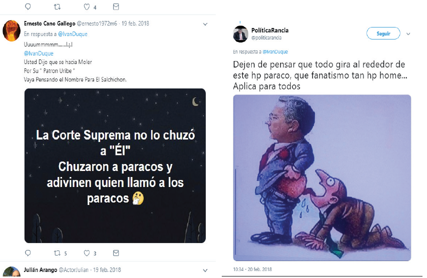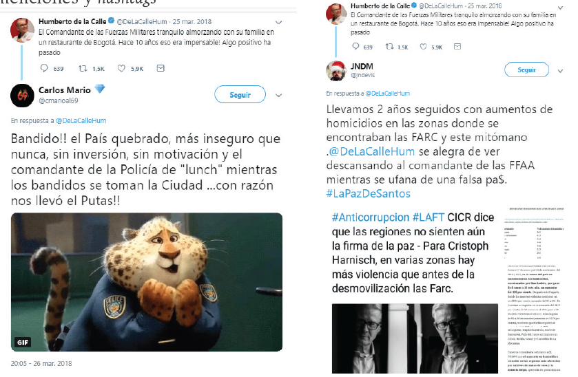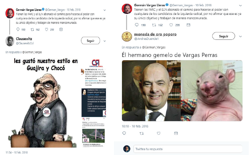 En el tuit de Germán Vargas, relacionado con la categoría proceso de paz, se efectuaron 293 me gusta, 154 retuits y 1500 comentarios. Como respuesta al tuit de referencia, los participantes hicieron uso de caricaturas, a manera de crítica frontal hacia el candidato, así como de otros recursos como los montajes y las ediciones de imágenes, de forma similar a los casos precedentes, para ridiculizarlo y desprestigiarlo, relacionando datos e información alusiva a sus procesos judiciales. También utilizaron memes, hashtags y menciones directas (@).