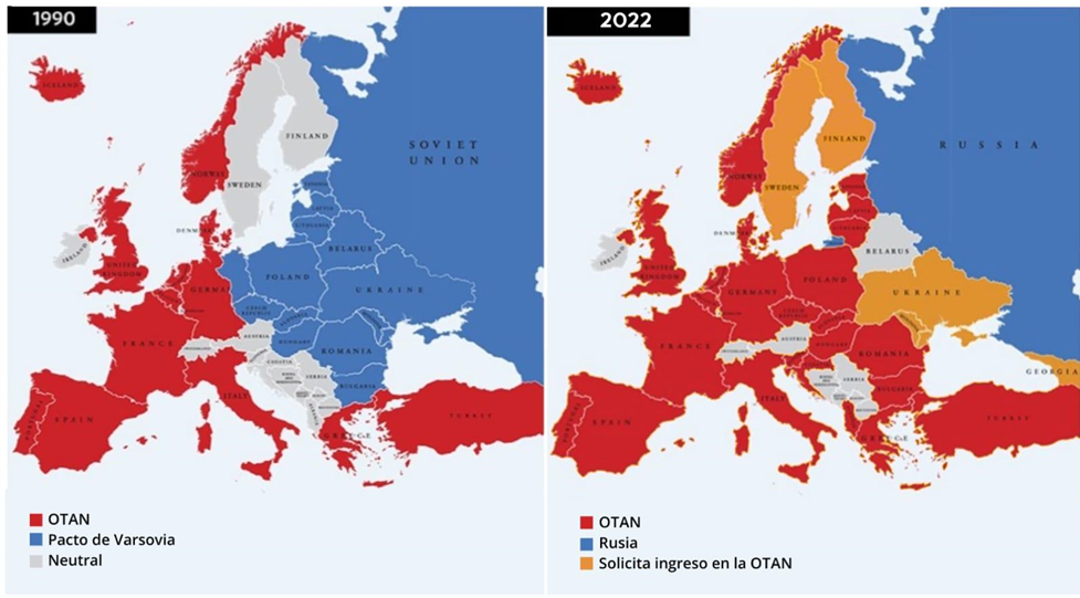 Un artículo del Financial Times lleno de la habitual letanía de lugares comunes señaló correctamente que, desde la reunificación de Alemania y el colapso de la URSS, 12 países se han unido a la OTAN, que tres de ellos —los estados bálticos— eran antiguas repúblicas soviéticas, y que siete más eran anteriormente miembros de la alianza militar del Pacto de Varsovia liderada por Moscú. El flanco oriental de la OTAN está hoy en día 1.100 kilómetros más cerca del Kremlin que la frontera de Alemania Occidental en 1989. Y, sin embargo, el resultado ha sido un continente con más armas y soldados en estado de alerta máxima de lo que ha visto durante décadas, pero sin los acuerdos de la Guerra Fría que proporcionaban tranquilidad. “Podría decirse que Europa es menos segura hoy que en cualquier otro momento desde 1945”, concluye el artículo (Foy, 2022).