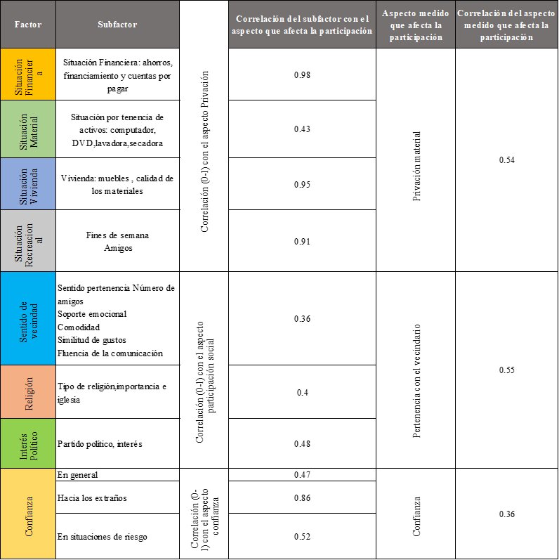 La pobreza es un condicionante de la participación en términos generales, priva al individuo de hacer parte del proceso de formación del capital social en la medida que niega el acceso de ciertos recursos necesarios para el ejercicio de la ciudadanía y por ende limita su capacidad de integrarse a la comunidad. Tales recursos son de diversa índole y van desde la credibilidad en las personas, la pertenencia a organizaciones y la capacidad económica de adquisición (Townsend, 1979). De manera complementaria, el trabajo de Ferragina, Tomlinson y Walker (2013) midió cuantitativamente [3] la participación como un fenómeno explicado por tres variables significativas a nivel estadístico: privación —cobertura de las necesidades básicas—, participación social y confianza. La primera variable —privación— está compuesta por el aspecto financiero de los hogares —ingresos, ahorros y deudas—, el alojamiento y calidad de vivienda. De manera agregada dicho aspecto económico tiene una correlación o influencia lo suficientemente significativa (0.98) con la privación y está a su vez de 0.54 con la variable principal: la participación (ver tabla 1); corroborando la tesis sobre la incidencia positiva del aspecto económico sobre la participación.