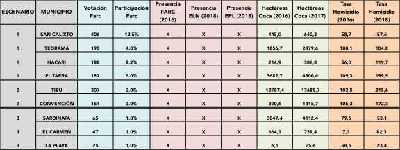 Este escenario está conformado de manera general por San Calixto, Hacarí, Teorama y El Tarra, municipios donde tanto la favorabilidad como la concentración espacial de la votación del partido Farc en las elecciones parlamentarias de 2018 fueron mayores.