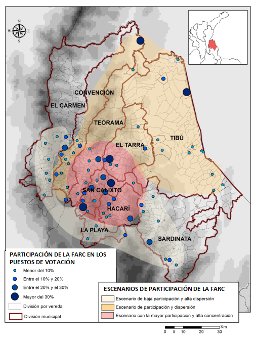 Bajo esta perspectiva, se identificaron en el Catatumbo tres escenarios generales, en donde el apoyo electoral a la Farc se expresó de manera distinta en términos del número de votos y los patrones de distribución espacial. Un primer escenario identificado correspondió en general con los municipios de San Calixto, Hacarí, Teorama y El Tarra, donde la influencia de las FARC sobre la población alcanzó su nivel más alto y los resultados electorales dieron cuenta de un mayor apoyo y concentración espacial de la votación de la Farc. Un segundo escenario de estudio correspondió a los municipios de Tibú y Convención, donde la influencia de las FARC sobre la población se debilita en los últimos años, razón por la cual se registró con respecto al escenario anterior menor apoyo y concentración espacial de los votos de la Farc. Finalmente, el tercer escenario conformado en general por los municipios de Sardinata, La Playa y El Carmen, donde la presencia guerrillera no ha tenido bases estables y por lo tanto la influencia de las FARC sobre la población no pasó de ser esporádica y marginal, se caracterizó no sólo por el bajo apoyo a la Farc, sino además por una alta dispersión espacial en cuanto a los puestos donde se registra la votación.