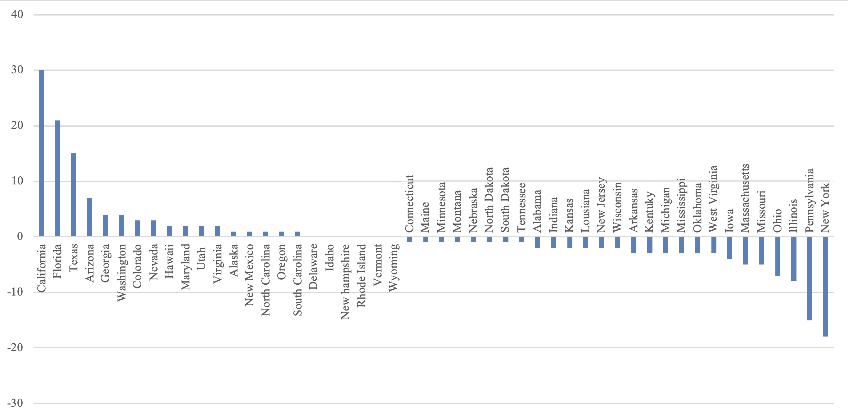 Mediante la figura 2 podemos ver las variaciones en el poder de influencia que han tenido los estados a la hora de elegir al presidente durante la vigencia del método de Huntington-Hill. Al Ponerla en contexto con la tabla 1donde se observa la evolución del número de escaños desde el primer uso del actual método de reparto de escaños para la Cámara de Representantes —ya que el número de Senadores permanece constante—, podemos observar que California, Florida y Texas son los estados que más crecen, con un aumento de 66 escaños entre los 3, encontrándose estos entre los Estados con una tasa de población más elevada del país (Lee & Oppenheimer, 1999, pp. 10-12). Mientras que Illinois, Pensilvania y Nueva York son los que más pierden, con una pérdida de 41 escaños entre los 3.