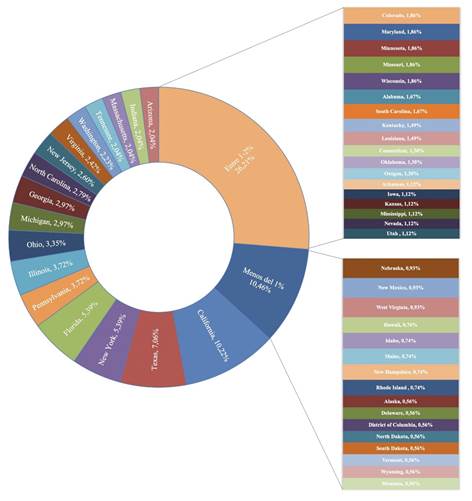 Como puede observarse en la figura 3, que representa los valores de influencia de los Estados durante la vigencia del censo actual (censo de 2010), cuando los votos electorales de los Estados que tienen menos de un 1 % de peso específico en el Electoral College: Wyoming, Vermont, South Dakota, North Dakota, Montana, District of Columbia, Delaware, Alaska, Rhode Island, New Hampshire, Maine, Idaho, Hawái, West Virginia, New Mexico y Nebraska; suman 65 votos electorales, apenas 5 más de los 55 votos electorales de California. Si además de los que tienen menos de un 1 % de peso específico, sumamos los que representan entre un 1 y un 2 % del peso del Electoral College, obtenemos casi un 40 % de los votos electorales (37.67 %) que dependen de Estados que suponen menos de un 2 % del total, como se muestra en la figura 3.