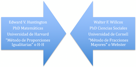 Los enfrentamientos entre Willcox y Huntington quedaron grabados en los anales del Congreso, cuando durante 1927 y 1928 la Cámara de Representantes entrevistó a los defensores de los distintos métodos para evaluar las opciones posibles para el prorrateo de la siguiente década. No contento con esto, Willcox y Huntington protagonizaron unos acalorados debates académicos a través de distintas publicaciones entre ellas la prestigiosa revista Science durante 1928 y 1929; y después, en menor medida, hasta 1942 [5] . Las discrepancias entre estos dos hombres, cada uno destacado referente en su campo de investigación, hizo que este enfrentamiento fuera no solo entre dos personas sino entre las dos disciplinas que representaban, sus universidades, etcétera (Pukelsheim, 2017, p. 311). Como puede verse en la figura 4.