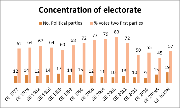 We define those two problems, the end of the two-party system and the emergence of new and successful political parties, as the core issues of this paper, mainly, due to two reasons. First, the two-party system has been institutionalised (Mainwaring, 1998) in the Spanish political system since the first elections (1977 and 1979) held in the democratic transition. Second, the constituencies of the parties which have emerged for General Elections in 2015-2016 and 2019 —mainly, Podemos, Ciudadanos and VOX— are much younger than those of the “traditional” parties.