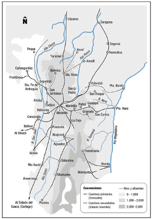 Ya a finales del siglo XIX y desde Medellín se tenía un camino que se dividía en tres ramales para llegar a Manizales: 1) la rama derecha por Belén, Heliconia y llegaba a las márgenes del río Cauca; 2) la del centro que pasa por Itagüí, Estrella, Caldas, Fredonia, Poblanco, Nueva Caramanta y entra al departamento del Cauca; y 3) la de la izquierda, que pasa por Envigado, El Retiro, la Ceja, Abejorral, Aguadas, Pácora, Salamina, Aránzazu, Neira y Manizales, para luego entrar al departamento del Cauca (AHA 1888, Anuario..., 203-206). Poblaciones que de cierto modo estaban comunicadas por caminos de herradura, tal y como lo muestra la figura 2: