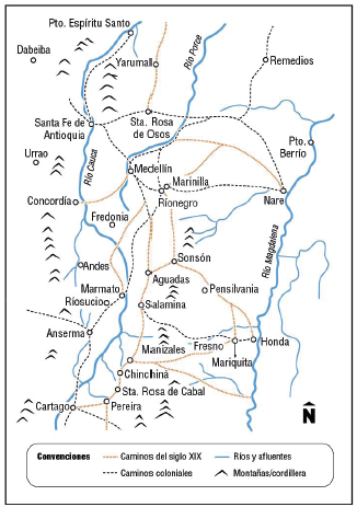 Giraldo-Mejía (1991), apoyándose en el texto de Fray Fabo (1926), advierte la existencia de tres grandes caminos en el siglo XIX: el del Ruiz, el de Herveo y el que comunicaba a Mariquita con Sonsón. Esa configuración de la localidad y la región que de esta devino, se apoyará inicialmente en cierta estrategia militar, en un contexto de pugnas y contradicciones entre los distintos Estados soberanos (Antioquia, Cauca y Tolima), en una zona de frontera, al sur de Antioquia la Grande. Posteriormente, su articulación, en gran parte, se debe a la necesidad de intercambio comercial con las regiones vecinas, y en especial por su proceso de especialización agro-exportadora a partir del café.