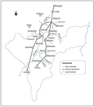 Este fenómeno poblacional y migratorio tendrá su impacto en términos de desarrollo socioeconómico durante el siglo XX. Varios de estas poblaciones se consolidaron como centros urbanos y productivos orientados al mercado internacional, pero advirtiendo que la población rural era mayoritaria.6 Es recurrente señalar que su consolidación no hubiera sido posible si no existiese una red de caminos, al punto que autores como Santa (1993) consideran a la "colonización antioqueña" como una empresa de caminos. Valencia-Llano (1990), quien trabaja la problemática colonizadora en torno al Gran Caldas y Manizales, identifica la ruta, tomando en cuenta como punto de partida a Rionegro, La Ceja y Abejorral (figura 5). Fueron caminos que se apoyaban en puentes de trapecio o puentes de arriería, un modo artesanal -la carpintería de armar o carpintería de lo blanco- para poder sortear las dificultades de las quebradas y los ríos como lo demuestran Galindo-Díaz, Flórez-Restrepo y Henao (2013).