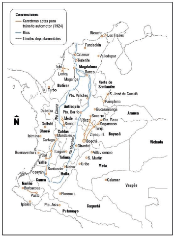 El Estado nacional interviene y las vías adquieren importancia nacional según su longitud. Siguiendo a Alvear-Sanín (2008, 215) la Ley 60 de 1905 declaró como vías nacionales todas, incluidas las férreas, que tuvieran más de 50 kilómetros y canalización de ríos. Estas serían atendidas por el gobierno nacional. Las demás serán atendidas por los departamentos y municipios, pero apoyados con el trabajo individual obligatorio de los vecinos de la localidad beneficiada. La obligación ya existía con la Ley 17 de 1864, cuando se estipuló que el mantenimiento de los caminos estaba a manos de los vecinos de un pueblo con trabajo individual obligatorio, aunque algunos cabildos hacían nugatoria las contribuciones en dinero. Ya con la Ley 70 de 1916 el gobierno nacional clasificó las vías en nacionales -las que unen la capital con los centros estratégicos importantes, con las fronteras y con los puertos marítimos y fluviales-, departamentales y municipales (Alvear-Sanín 2008, 433). Hacia 1924 el país contaba con unos 700 u 800 kilómetros de carreteras en pésimas condiciones, donde de vez en cuando se aventuraba a transitar un camión o un automóvil (figura 7).