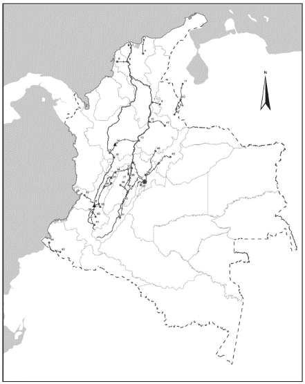 Los anteriores trazados tenían relación o continuidad con los caminos existentes durante la Colonia, como se muestra en la figura 3, inicialmente representada por Poveda-Ramos (1974).